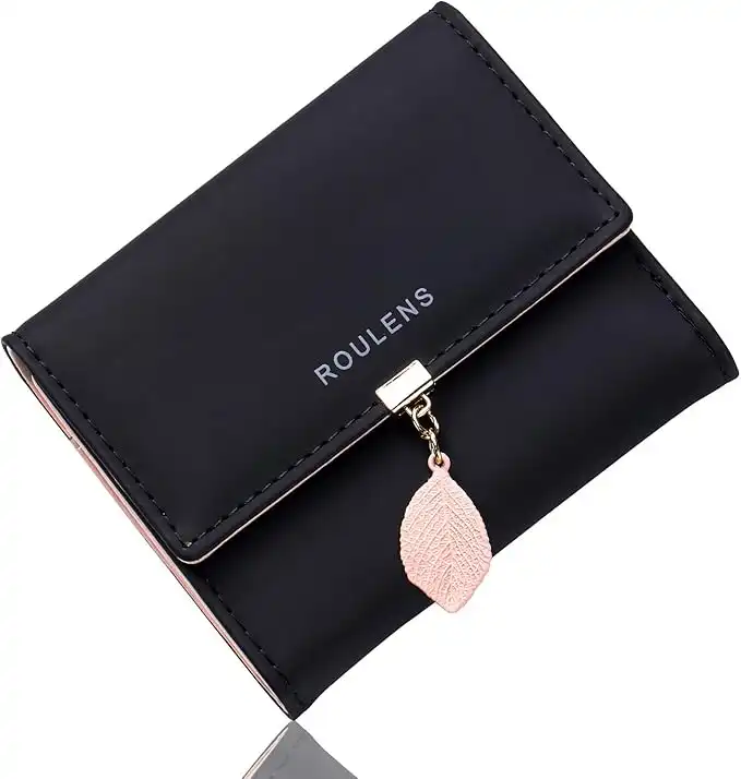 amazon.aeRoulens Ladies Purse, PU Leather Wallet for Women with RFID Leaf Pendant Zipper Coin Long Purse with Multiple Card Slots and Card Holders Phone Pocket, Black-s, S