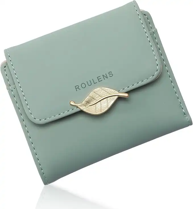 Roulens Small Wallet PU Leather Purse RFID Purse for Women with Leaf Pendant with Zipper, B-green, S