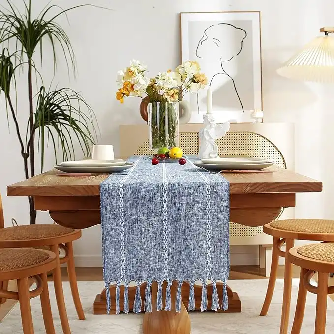 Rustic Farmhouse Style Linen Table Runner, Boho Handmade Tassel Embroidery Table Runners 90 Inches Long for Holiday Party, Dresser and Dining Decorations, 13 x 90 inch - Blue — Price History & Tracker | DeserTracker