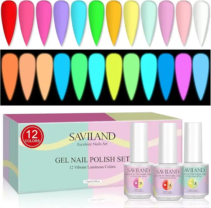 SAVILAND Glows in The Dark Gel Nail Polish Set - 12 Colors Luminous Neon Nail Gel Polish Set Soak off U V/LED Glow Effect Nail Polish for DIY Nail Art Design Valentines Day Gifts for Women — Price History & Tracker | DeserTracker