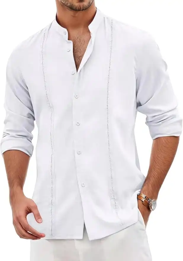 SEAUR Mens Cotton Linen Henley T Shirts Summer Beach Tops Band Collar Slim Fit Shirt for Informal Business