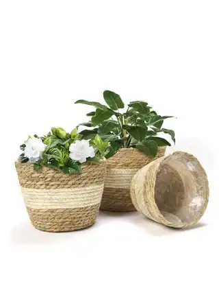 noon.comSet Of 3 Plant Baskets Flower Pots Seagrass Flower Pot Baskets Indoor With Plastic Liner Water Hyacinth And Corn Stalk Woven Planters Flower Basket Planter Basket For Home Floor Potted Pots Decor Covers Plant Containers