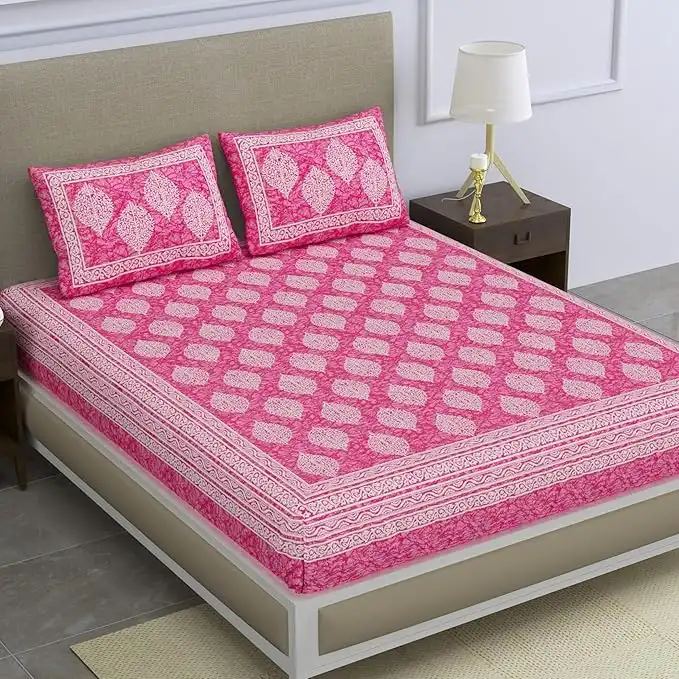 SheetKart 144 TC Cotton Printed Jaipuri Double Bedsheet King Size with 2 Pillow Covers, Pink