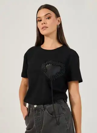 Short Sleeve Heart Applique Detailed Knitted Round Neck T-shirt