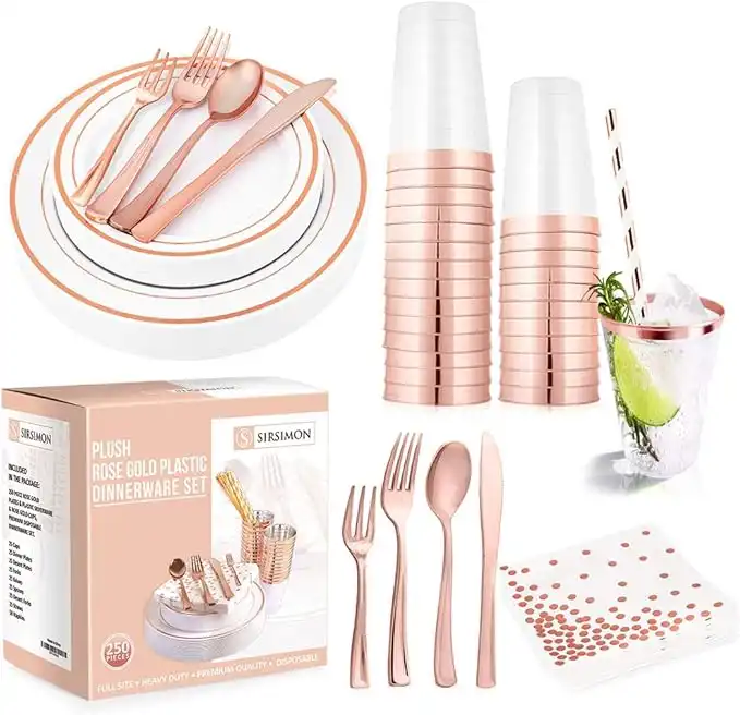 amazon.aeSIRSIMON 250 Piece Disposable Rose Gold Plastic Dinnerware Set - 50 Rose Gold Plastic Plates - 25 Rose Gold Plastic Silverware - 25 RoseGold Cups and Straws - 50 Fancy Napkins, Wedding or Party of 25