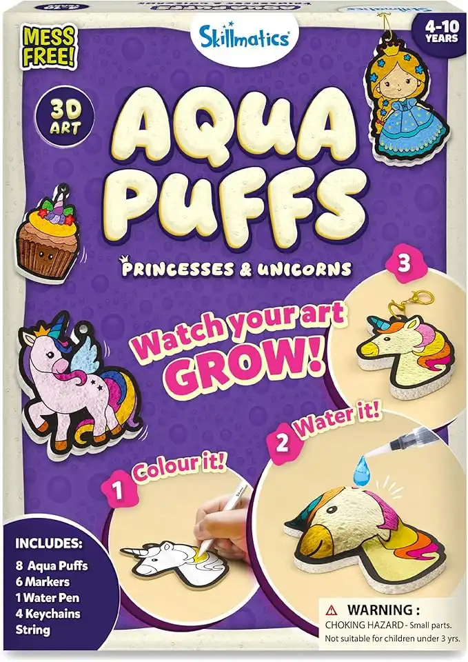 Skillmatics Aqua Puffs - 3D Art Kit, Princesses & Unicorns, Mess-Free Painting Craft for Kids, DIY Colour & Inflate Activity, Travel Toys & Creative Gifts for Girls & Boys Ages 4, 5, 6, 7, 8, 9, 10