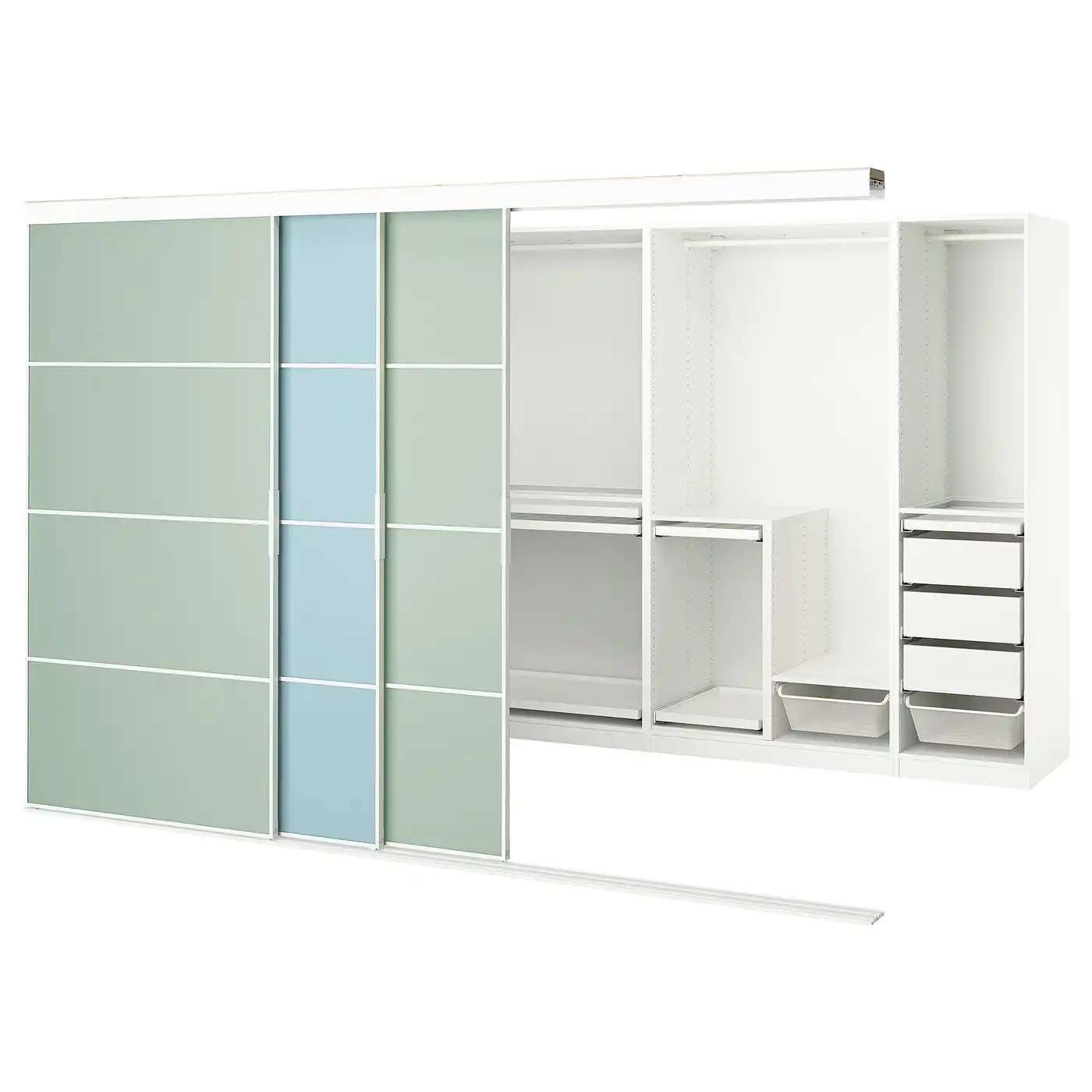 SKYTTA / PAX Walk-in wardrobe with sliding doors - white double sided/Mehamn light blue/light green 301x160x205 cm