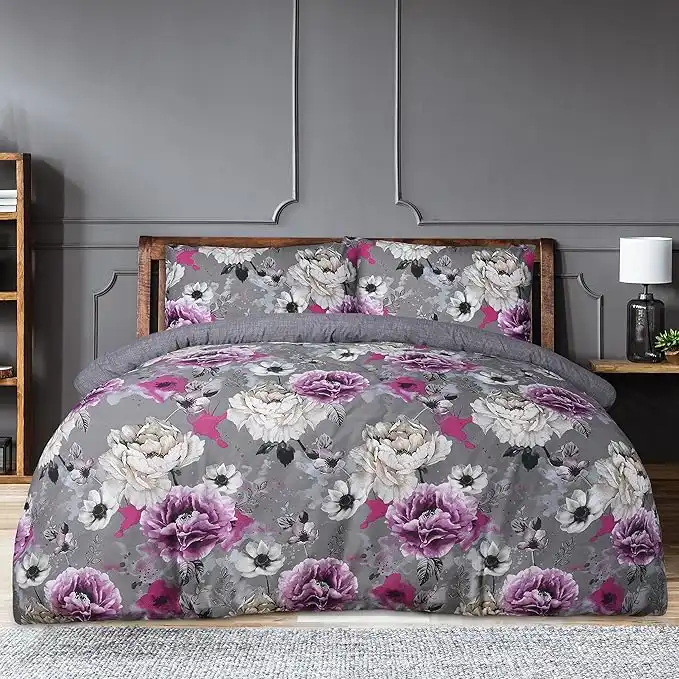 Sleepdown Inky Floral Grey Easy Care Soft Cosy Reversible Duvet Cover Quilt Bedding Set with Pillowcases - Single (135cm x 200cm)