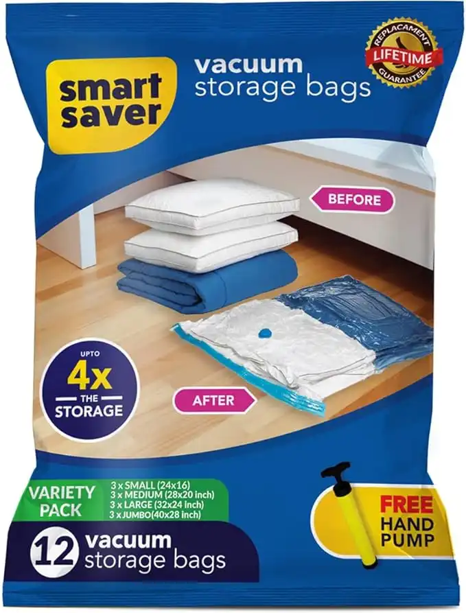 Smart Saver 12 Pack Vacuum Space Bags (3 Jumbo,3 Large,3 Medium,3 Small) for Clothes Storage, Bedding,Pillows, travelling, Vaccum Sealer Compression Airtight Reusable Bag with Travel Hand Pump — Price History & Tracker | DeserTracker