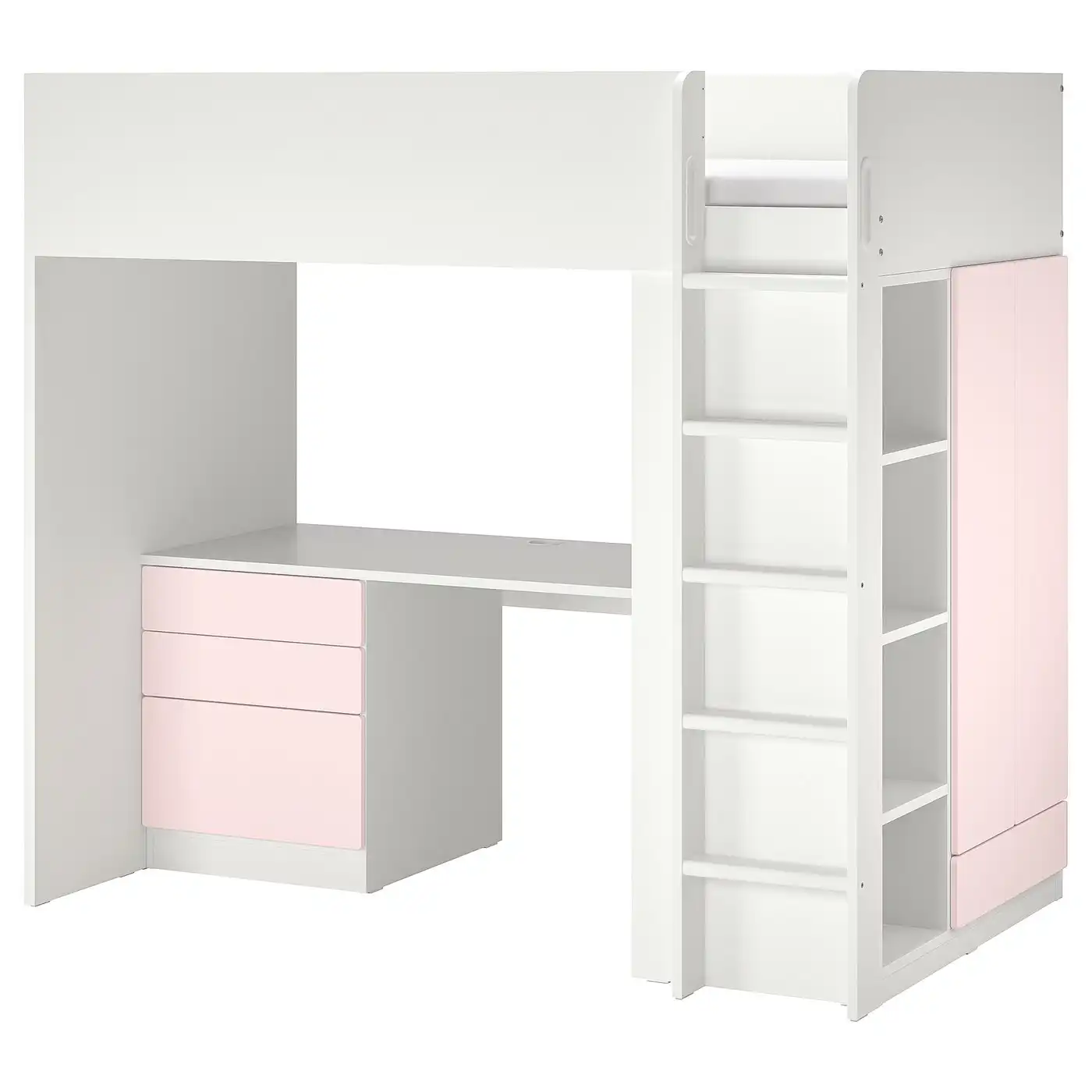 SMÅSTAD Loft bed - white pale pink/with desk with 2 shelves 90x200 cm