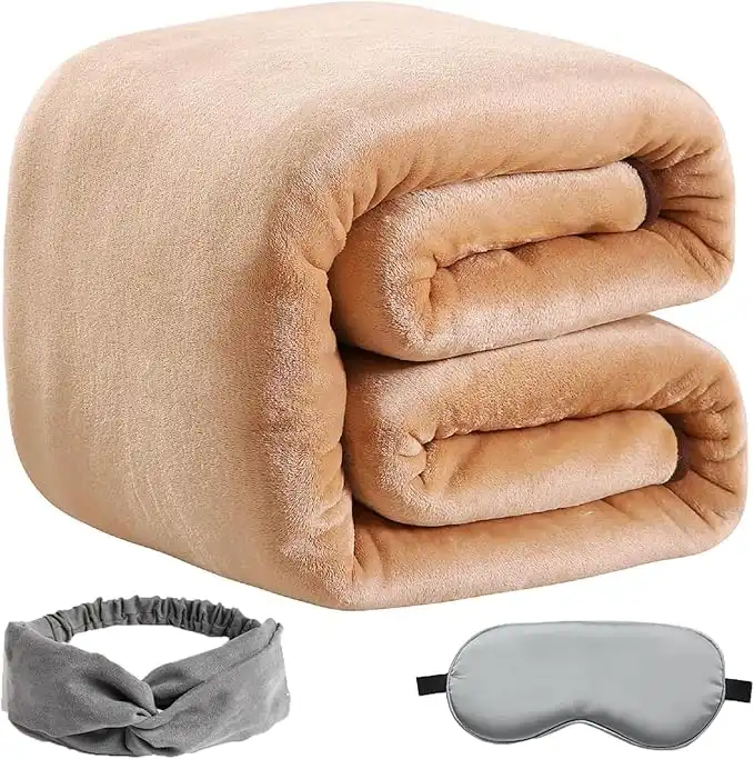 SOFTCARE Fleece 66"*90" Bed Blanket with Eye Mask & Headband, All-Season,Anti-Static,Thicken 350GSM Warm Fuzzy Blanket Lightweight Thermal Blanket for Couch,Bed,and Sofa-Camel,Twin Size