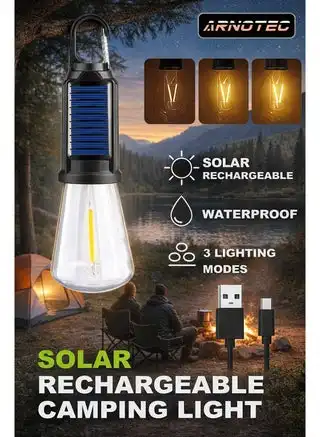 noon.comSolar Rechargeable Camping Light, Portable LED Tent Lantern with 3 Brightness Modes, Waterproof Outdoor Lamp with Type-C & Solar Charging, Lightweight Hanging Lantern for Hiking, Camping, Emergency & Home Use (1 Pack)