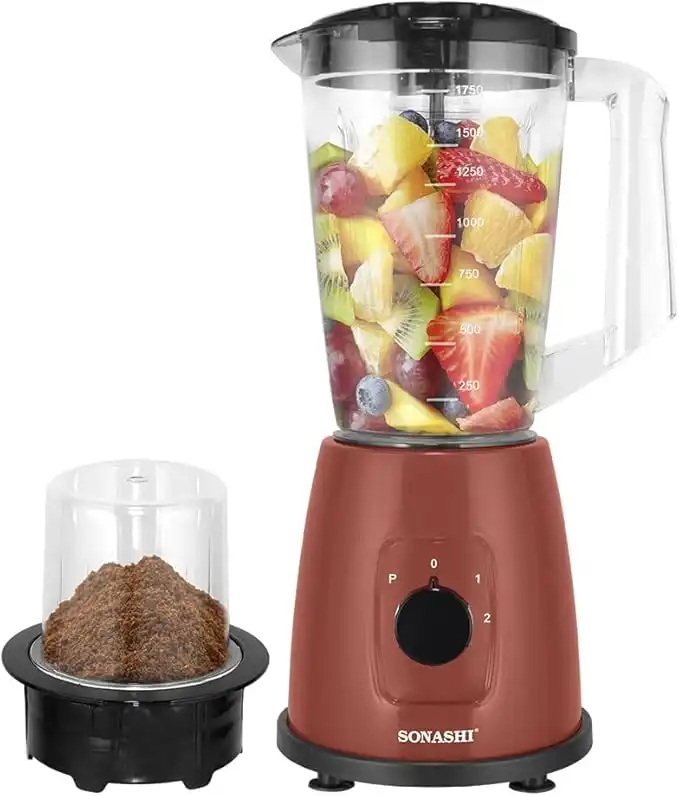 Sonashi 2-in-1 Powerful Blender – 1.8L Unbreakable Jar with Grinding Cup | Stainless Steel Blades with Pulse Control | Heavy-Duty Motor with Overheat Protection | 2-Speed Settings | SB-162 600W Red