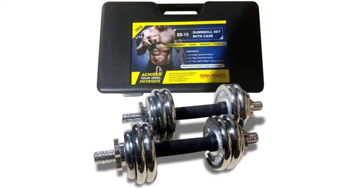 Sparnod Fitness 15kg Adjustable Dumbbell Weight Set With 2 Rods and 12 Weight Plates – Chrome Dumbbells with Anti-slip Grip & Carry Case (SD-15) — Price History & Tracker | DeserTracker