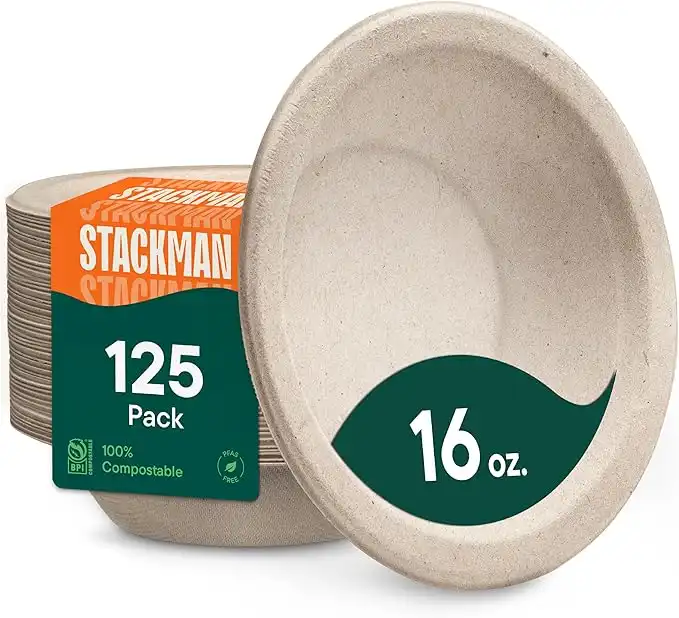 Stack Man 100% Compostable 16 oz. Paper Bowls [125-Pack] Heavy-Duty Disposable Bowls Bulk Pack, Eco-Friendly Natural Unbleached Bagasse, Hot or Cold Use, Biodegradable Made of Sugar Cane Fibers — Price History & Tracker | DeserTracker