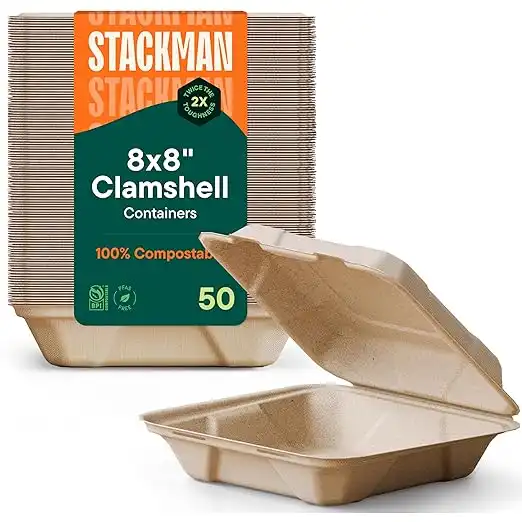 amazon.aeStack Man 100% Compostable Clamshell Take Out Food Containers [8X8" 50-Pack] Heavy-Duty Quality to go Containers, Natural Disposable Bagasse, Eco-Friendly Biodegradable Made of Sugar Cane Fibers