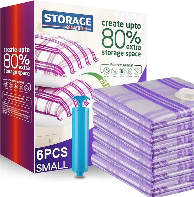 STORAGE MASTER Space Saver Bags for Travel and Home Reusable Vacuum Storage Bags Save 80% More Storage Space with Travel Hand Pump (6-Small)