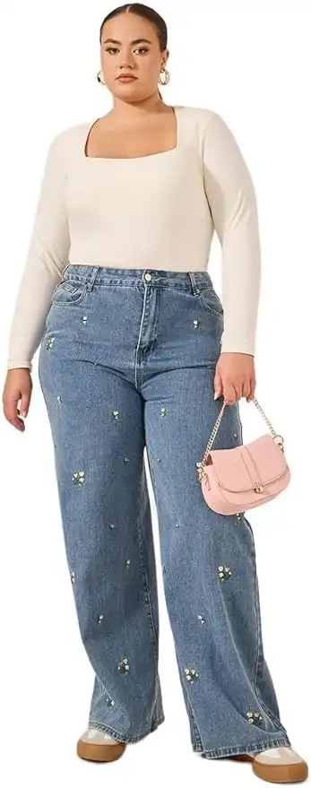 Styli Women's Plus Size High Rise Embroidered Wide Leg Jeans