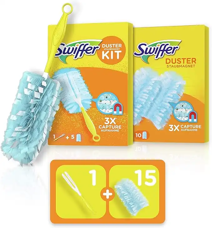 Swiffer Duster Kit, 1 Duster + 15 Refills, Dust Duster, Catches and Retains Up to 3 Times More Hair and Dust Than a Regular Duster