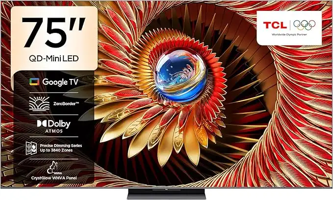 TCL 75C8K Television 75 Inch Smart TV 4K QD-Mini LED Colorful Quantum Crystal HDR 4500nits Gaming Google TV, 144Hz Native Refresh Rate, Audio by Bang & Olufsen, IMAX Enhanced, Game Master (2025 Model)