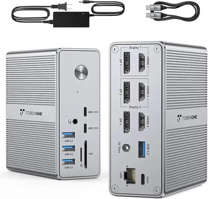 TobenONE DisplayLink Docking Station Triple Monitor with UK 120W Power Adapter, Triple 4K Display for MacBook Pro/Air, Thunderbolt 5/4/3, USB-C Windows(3X HDMI 3X DisplayPort 2xUSB-C 4xUSB 3.2 SD/TF)