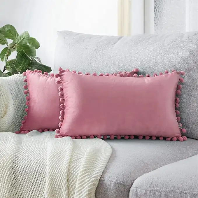 Top Finel Decorative Lumbar Throw Pillow Covers for Couch Bed Soft Velvet Pillowcases Rectangle Cushion Covers with Pom-poms 12x20 Inch 30 x 50 cm, Pack of 2, Grey