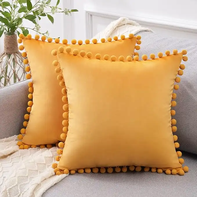 Top Finel Decorative Throw Pillow Covers with Pom Poms Soft Particles Velvet Solid Cushion Covers 16 X 16 for Couch Bedroom Car, Pack of 2, Mustard Yellow — Price History & Tracker | DeserTracker