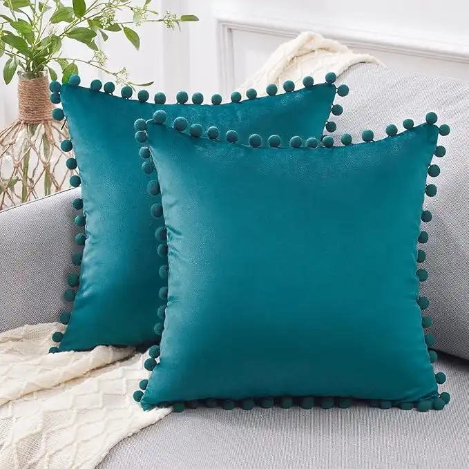 Top Finel Pack of 2 Teal Decorative Throw Pillow Covers 16x16 inches, Farmhouse Boho Couch Pillow Covers Soft Velvet Cushion Cases with Pom-poms for Bedroom Living Room Spring Easter Home Decor — Price History & Tracker | DeserTracker
