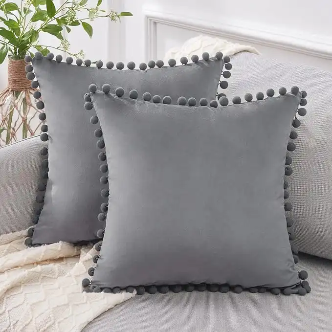 amazon.aeTop Finel Set of 2 Decorative Throw Pillow Covers 18x18 Inch Grey Pillow Cover Soft Velvet Cushion Cases with Pom Poms for Couch Bedroom Livingroom Patio Porch Chair