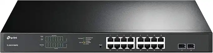 TP-Link TL-SG1218MPE 16-Port PoE+ Gigabit RJ45 ports, 2× Gigabit non-PoE RJ45 Ports and 2× Combo Gigabit SFP slots (16 PoE+ Ports + 2 Gigabit RJ45 Ports + 2 SFP slots, 250 W, Rackmount)