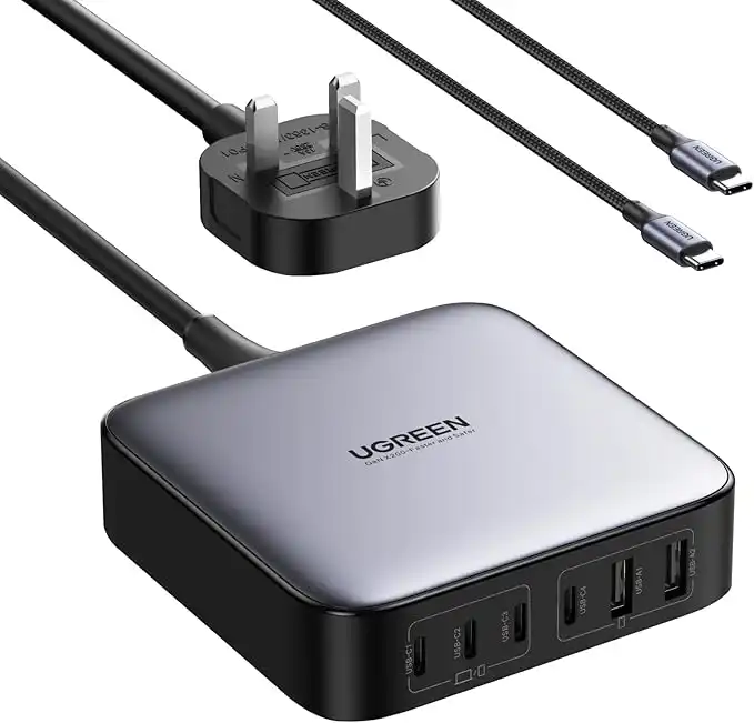 UGREEN Nexode 200W 6-Ports USB C Charging Station with 100W Cable, GaN Fast Charging Laptop Adapter with Multiple Protection Stable Desktop Stand Charger for MacBook Pro/iPhone 17/Samsung S25(UK Plug)
