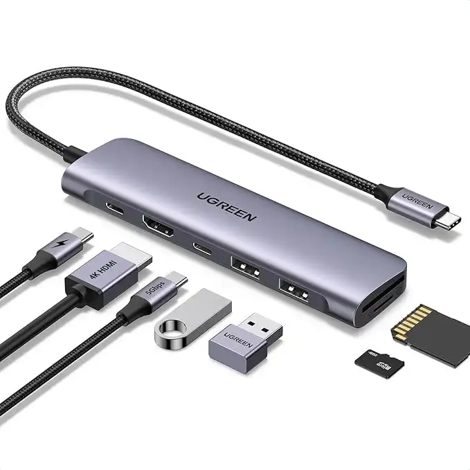 UGREEN Revodok USB C Hub 7-in-1 with [High-Speed] SD/TF Card Reader, 4K HDMI, Data Ports, 100W PD Charging [Braided Cable], USB-C Multiport Adapter for Windows, MacBook Pro, Monitor, Camera