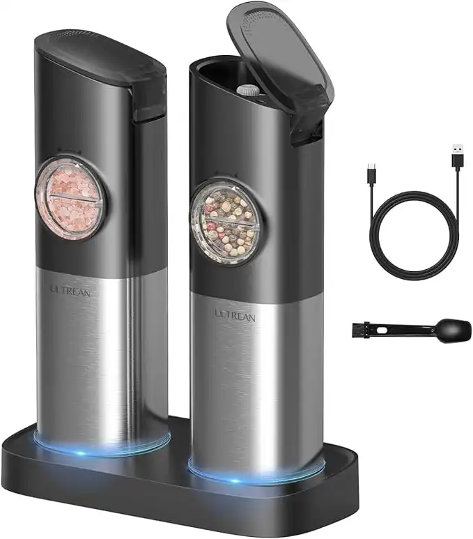 Ultrean Gravity Electric Salt and Pepper Grinder Set, USB Rechargeable With Dual Charging Base, Adjustable Fineness, Stainless Steel Construction, One Handed Operation, Auto Dust Lids, LED Light