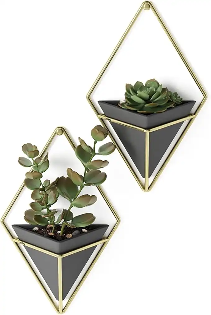 Umbra Trigg Hanging Planter Vase & Geometric Wall Decor Concrete Container - Great For Succulent Plants, Air Plant, Mini Cactus, Faux Plants And More, Set Of 2, Small, Black/Brass