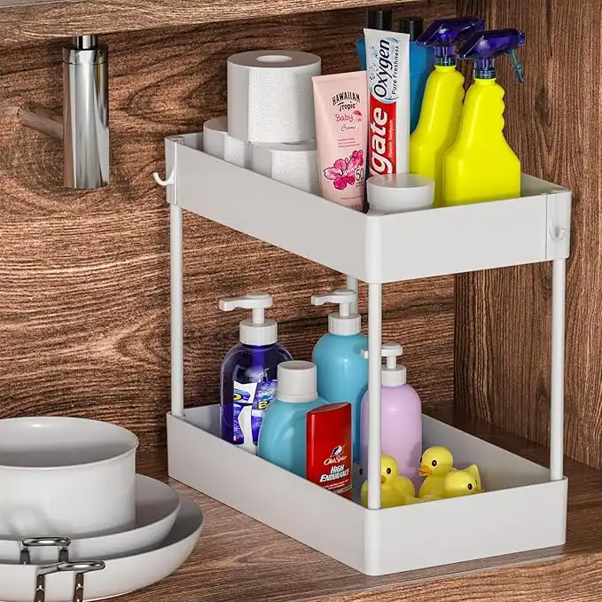 amazon.aeUnder Sink Organizer, Under Bathroom Sink Storage 2 Tier Organizer Bath Collection Baskets with Hooks, Under Sink Shelf Organizer Rack, Multi-purpose Under Sink Storage for Bathroom Kitchen