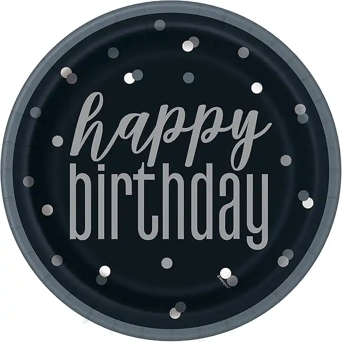 Unique 83587EU Eco Friendly Paper Plates-23cm-Glitter Black & Silver Pack of 8, Black, Happy Birthday