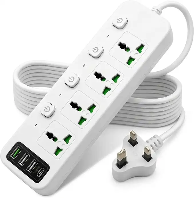 amazon.comUniversal Power Strip Extension Cord with 4 AC Outlets & 4 USB Ports (1 USB-C PD), Individual Switches, 2M Heavy Duty Cable, UK 3-Pin Plug, Surge Protector for Home, Office & Kitchen - White