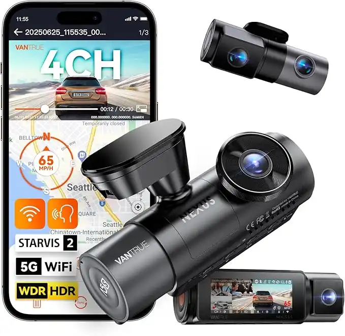 Vantrue N5S 4 Channel WiFi 360 Degree Dash Cam, STARVIS 2, IR Night Vision, 2.7K+1080P*2+1440P Front Rear Inside Dashcam, Voice Control, GPS, OTA Support, 24 Hours Parking Mode, Support 1TB Max