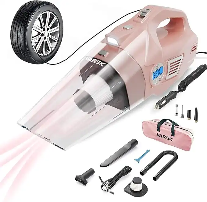 VARSK 4-in-1 Car Vacuum Cleaner High Power, Presents for Her Women Girls Mom, Pink Handheld Car Vacuum Portable Tire Inflator with Digital Tire Pressure Gauge LCD Display and Light, 12V DC, 15FT Cord