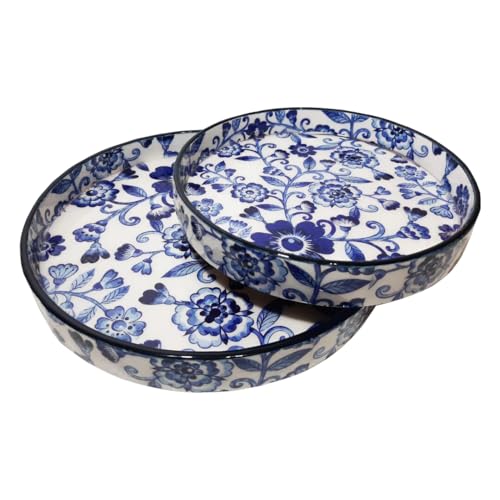 VDIX Sheesham Wood Serving Trays, Rustic Nesting Trays Stackable Platters for Serving Cakes, Pastries, Snacks, Breakfast, Coffee Table, Party… (Round Blue-2)