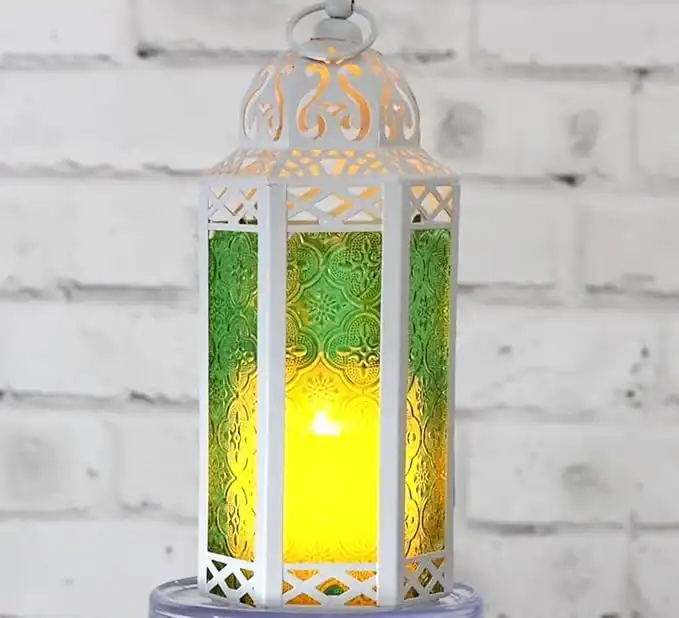 VELA LANTERNS 10.5" White Moroccan Lamp Lantern Decorative Candle Holder for Ramadan Decorations, Indoor Home Decor, Outdoor Patio or Porch, Weddings, Green Glass, Medium
