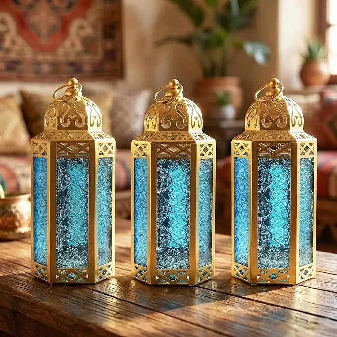 VELA LANTERNS 3pk Gold Moroccan Decor Candle Lantern, Decorative Candle Holder Lamp for Ramadan, Indoor Home Decor, Patio, Weddings, Table or Hanging, Blue Glass, Medium — Price History & Tracker | DeserTracker