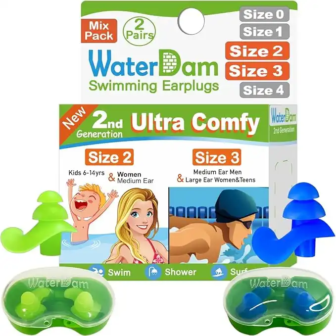 WaterDam Swimming Ear Plugs - Ultra Comfy Waterproof Earplugs Prevent Swimmer's Ear (Small & Large, Green & Blue)