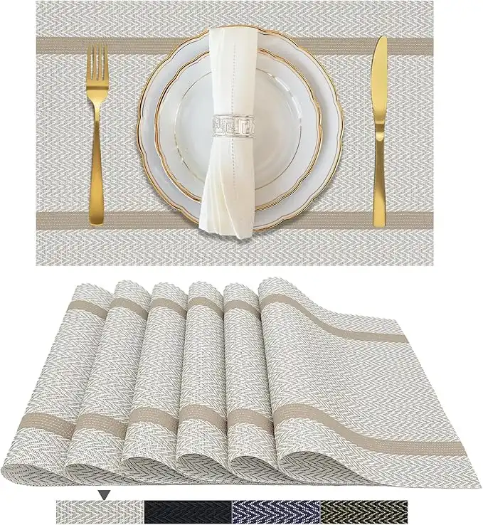amazon.comWhite Placemats Set of 6 - Washable Easy Clean Vinyl Placemats - Heat Resistant PVC Place Mats - Table Mats for Dining Table (White Gold Arrow Pattern)