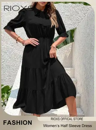 noon.comWomen's Half Sleeve Bow Tie Long Dress, Summer A-line Elastic High Waist Dress for Ladies, Casual Loose Lantern Sleeve Dress with Tiered Hem, Solid Color Tiered Ankle Length Formal Dress for Holiday Party Beach Dating Wrk Daily Wear, Black
