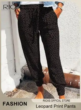 noon.comWomen's Long Pant, Casual Trousers With Front Pockets, Regular Fit Basic Trousers For Women, Ladies Classic Capri Pants, Baggy Wide Leg Pants, Elastic Waisted Loose Harem Pants, Comfy Beach Trousers For Work And Daily Wear-Black Leopard Trousers