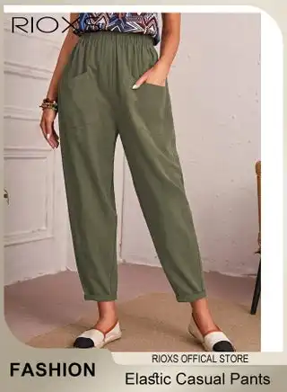 noon.comWomen's Long Pant, Casual Trousers With Front Pockets, Regular Fit Basic Trousers For Women, Ladies Classic Capri Pants, Baggy Wide Leg Pants, Elastic Waisted Loose Harem Pants, Comfy Beach Trousers For Work And Daily Wear-Green Trousers