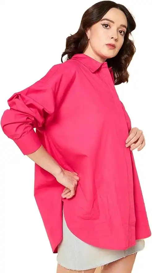 Women'S Pink 100% Cotton Solid Pattern Button Down Shirt