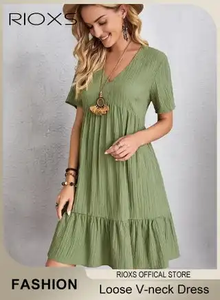 noon.comWomen's Short Sleeve V-neck Mini Dress, Loose Fit High Waisted A-Line Summer Dress for Ladies, Flowy Casual Ruffle Mini Dress, Comfortable Breathable Linen Dress for Beach Party Vacation Dating Daily Wear and More, Green