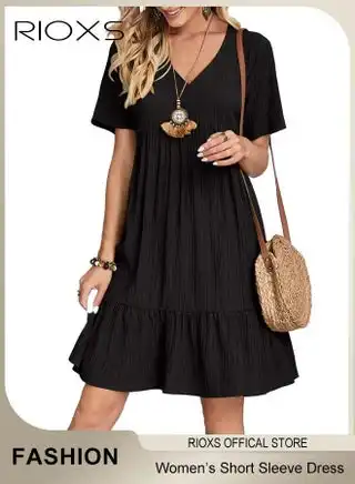 noon.comWomen's Short Sleeve V-neck Mini Dress, Loose Fit High Waisted A-Line Summer Dress for Ladies, Flowy Casual Ruffle Mini Dress, Comfortable Breathable Linen Dress for Beach Party Vacation Dating Daily Wear and More, Black